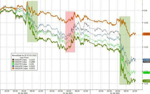 CPI数据导致市场认定7月加息为美联储本轮周期最后一次,美债收益率全线大幅跳水逾10个基点,对货币政策更敏感的短债收益率跌幅尤其猛烈。