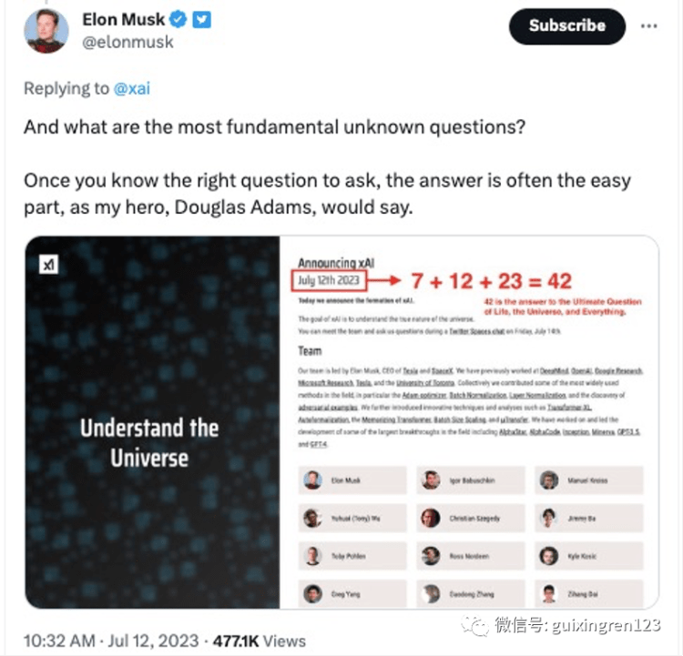 此外,马斯克又再一次的提到了他所钟爱的“42”这个数字。他在xAI的官方推特下配图回复,表示xAI发布的日期加总正好等于42。“42”在道格拉斯·亚当斯的科幻小说《银河系漫游指南》中,指代“生命、宇宙以及任何事情的终极答案”,被科幻迷广泛应用致敬。