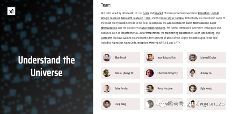 在xAI的团队介绍中,链接了团队的成员所参与研究和贡献的目前AI领域重要的技术和方法,表示致力于研究并领导该AI领域一些突破性的开发,包括AlphaStar、AlphaCode、Inception、Minerva、GPT-3.5和GPT-4等。