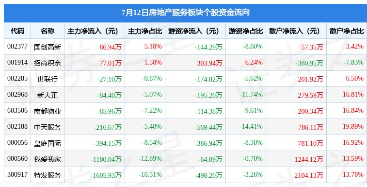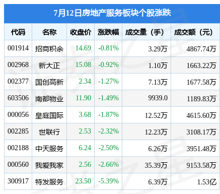 7月12日房地产服务板块较上一交易日下跌1.72%,特发服务领跌。当日上证指数报收于3196.13,下跌0.78%。深证成指报收于10919.26,下跌0.99%。房地产服务板块个股涨跌见下表: