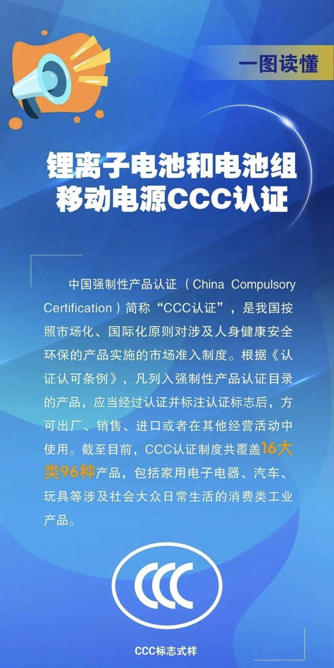市场监管总局发布公告,自2023年8月1日起对锂离子电池和电池组、移动电源实施CCC认证管理。自2024年8月1日起,未获得CCC认证证书和标注认证标志的,不得出厂、销售、进口或者在其他经营活动中使用。