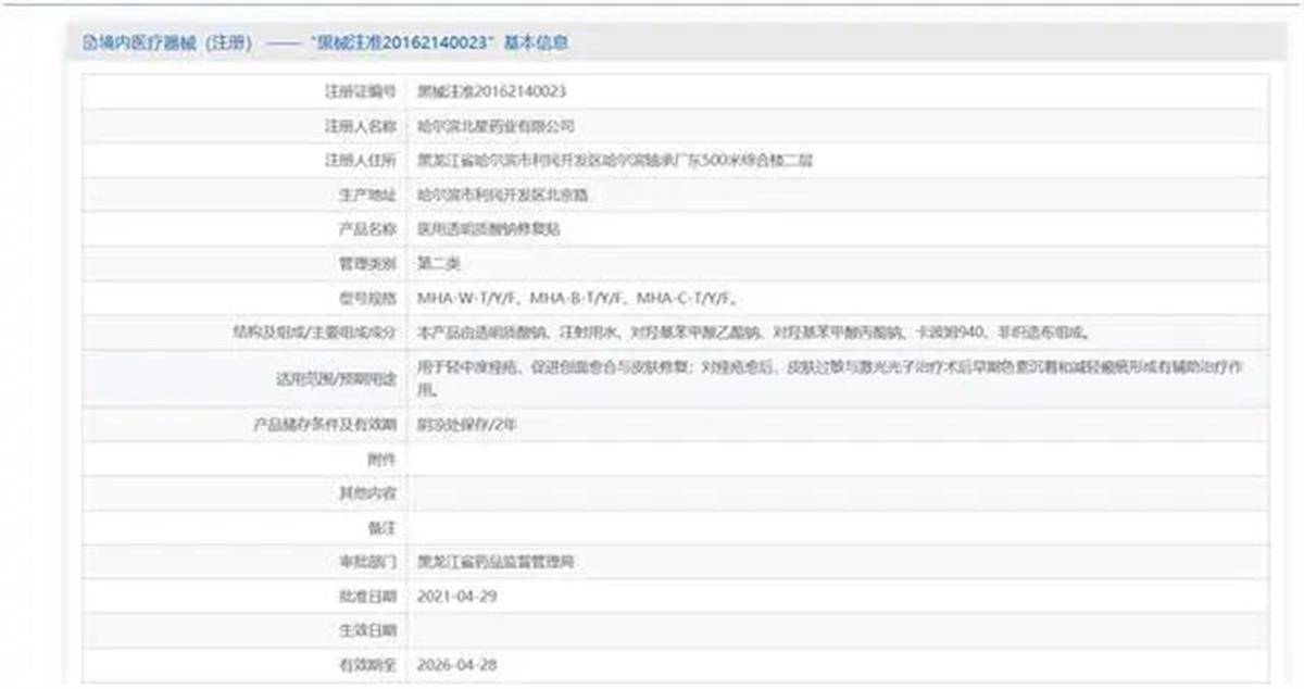 以招股书上披露的,医疗器械类产品收入占比最高的医用透明质酸钠修复贴为例。根据药监局网站的备案,该产品主要成分由透明质酸钠、注射用水、对羟基苯甲酸乙酯钠、对羟基苯甲酸丙酯钠、卡波姆940、非织造布组成。