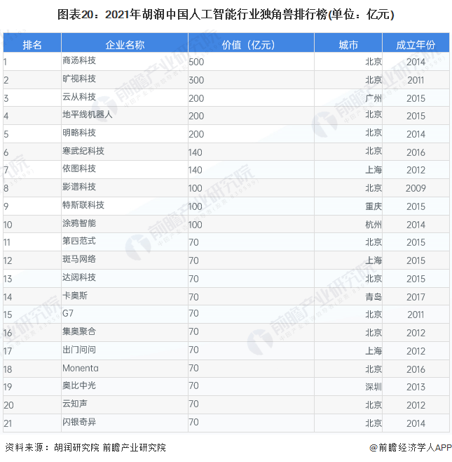从人工智能独角兽企业来看,根据胡润排行榜,商汤科技以500亿元的价值位列2021年胡润中国人工智能行业独角兽排行榜首位;其次,旷视科技、云从科技、地平线机器人与明略科技也具备较大的市场潜力,价值均超200亿元。