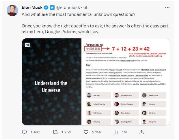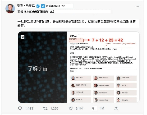马斯克在一条推文中披露了xAI成立日期中隐含的深意,他分享了一张xAI官网介绍页面的截图,将公司成立日期“2023年7月12日”标红,并在旁边加上一行文字:“7+12+23=42。42是生命、宇宙和万物的终极问题的答案”,“正如我的偶像道格拉斯·亚当斯所说的那样。”道格拉斯·亚当斯是科幻小说《银河系漫游指南》的作者,这是对少年时期的马斯克影响最深的一本书。
