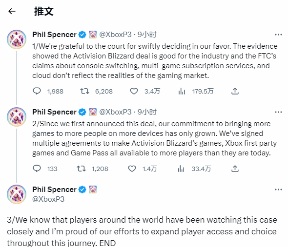 事后,Xbox负责人菲尔·斯宾塞发文庆祝微软的这次胜诉: