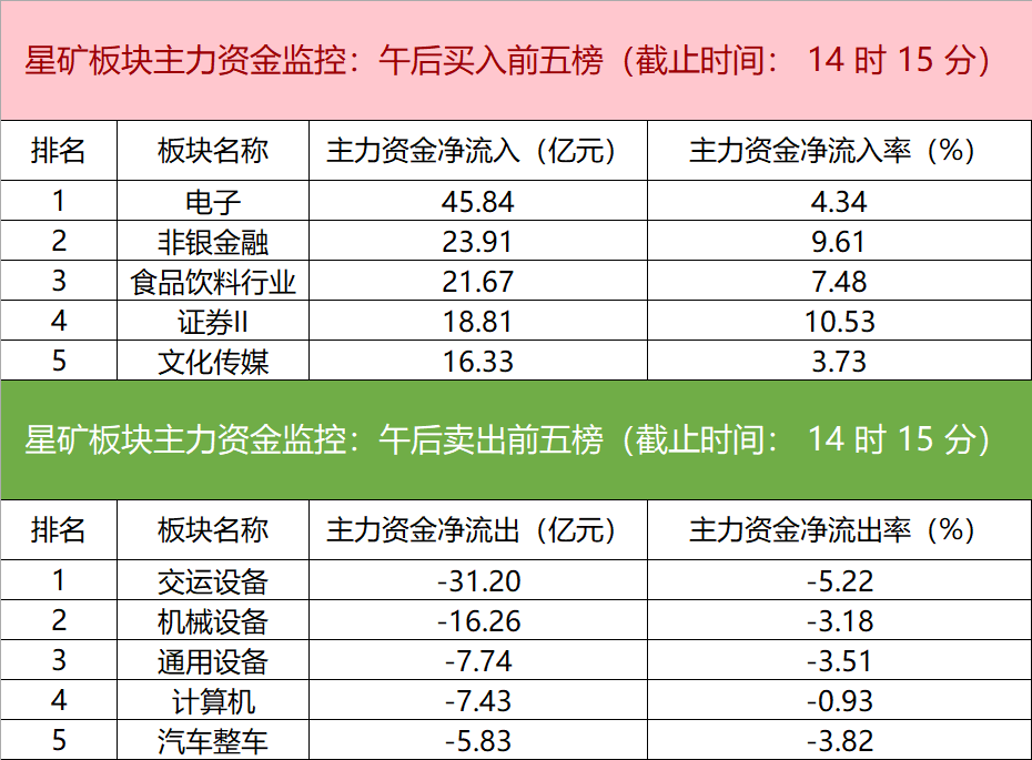 【主力资金监控:东方财富净买入超9亿元】财联社7月13日电,财联社星矿数据显示,今日主力资金净流入电子、非银金融、食品饮料行业等板块,净流出交运设备、机械设备、通用设备等板块,其中电子板块净流入45.84亿元。个股方面,东方财富上涨,主力资金净买入9.37亿元,五粮液、工业富联、立讯精密获主力资金净流入居前;众泰汽车遭净卖出超2亿元,中国电信、拓维信息、掌趣科技等主力资金净流出额居前。