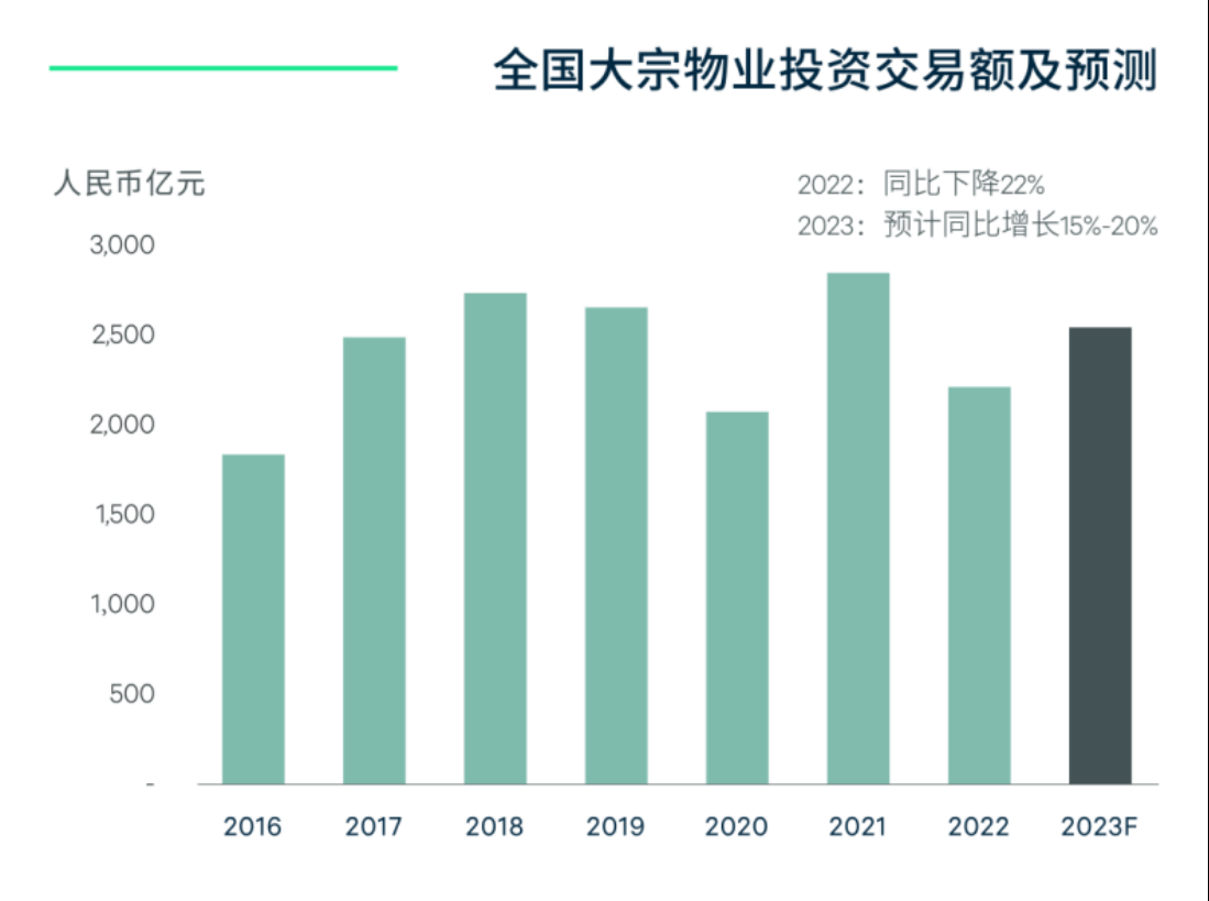 2022年中国大宗物业总交易额累计2200亿元。伴随一系列提振经济举措接连出台,CBRE世邦魏理仕预计,2023年中国商业地产投资市场有望反弹,大宗物业投资额或超2500亿元,同比上涨15%-20%。