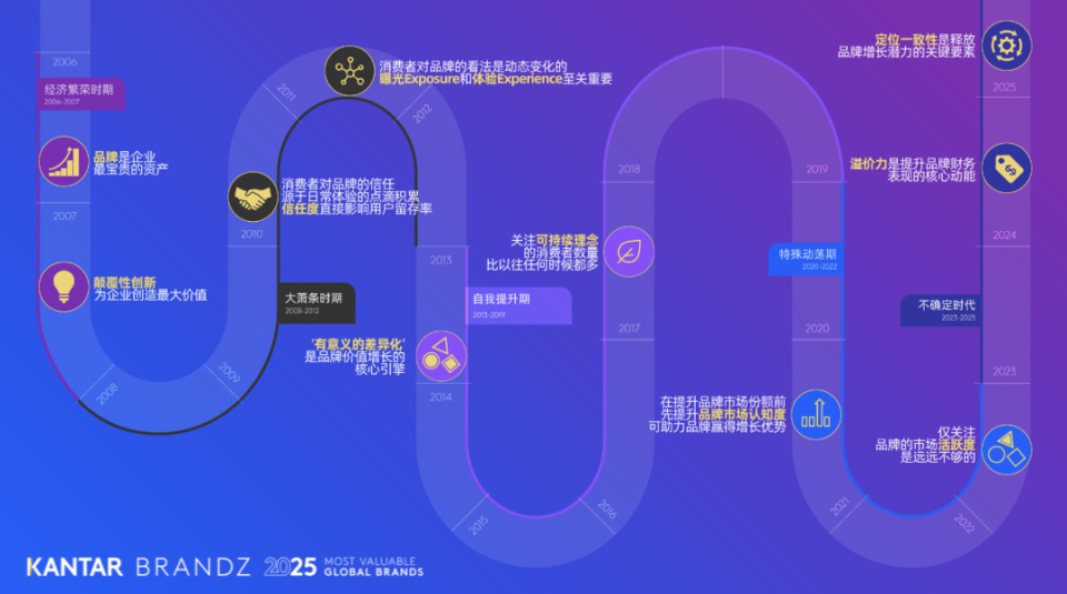 如果拉长时间线来看,凯度BrandZ榜单的20年,也恰值全球经贸格局经历重大震荡与深刻调整的关键阶段。从2008年的全球金融危机到2020年的特殊时期,复盘苹果、微软、腾讯、海尔等连续多年上榜企业的品牌价值曲线,可以清晰发现,品牌价值与企业抗风险能力呈正相关。这些成功穿越周期的企业让时代之问的答案愈发清晰:越是动荡的时代,品牌越能成为企业最确定的增长引擎,带领企业韧性成长。而这也是品牌上升到多个国家战略高度的关键原因之一。