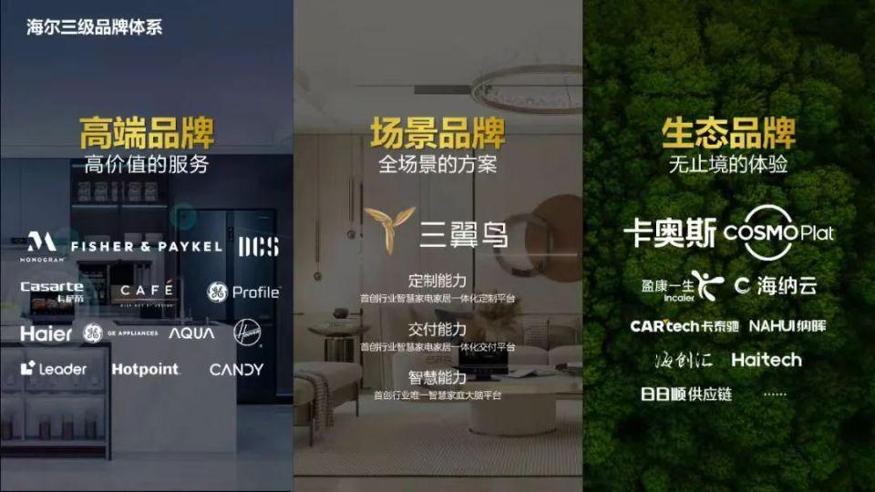 生态品牌创新最早:海尔是生态品牌的首创者、实践者与推动者,目前已构建起高端品牌、场景品牌、生态品牌三级品牌体系,如海尔首创的场景品牌三翼鸟日活用户达到1000万,在互联互通中为用户提供生活场景的最佳体验。