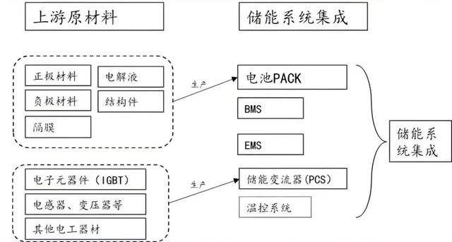 这就是一套储能系统的核心环节或零部件,分别是电池、BMS、EMS、变流器、温控系统,其实准确来说还应该加上一套安全系统,这个图上没有。