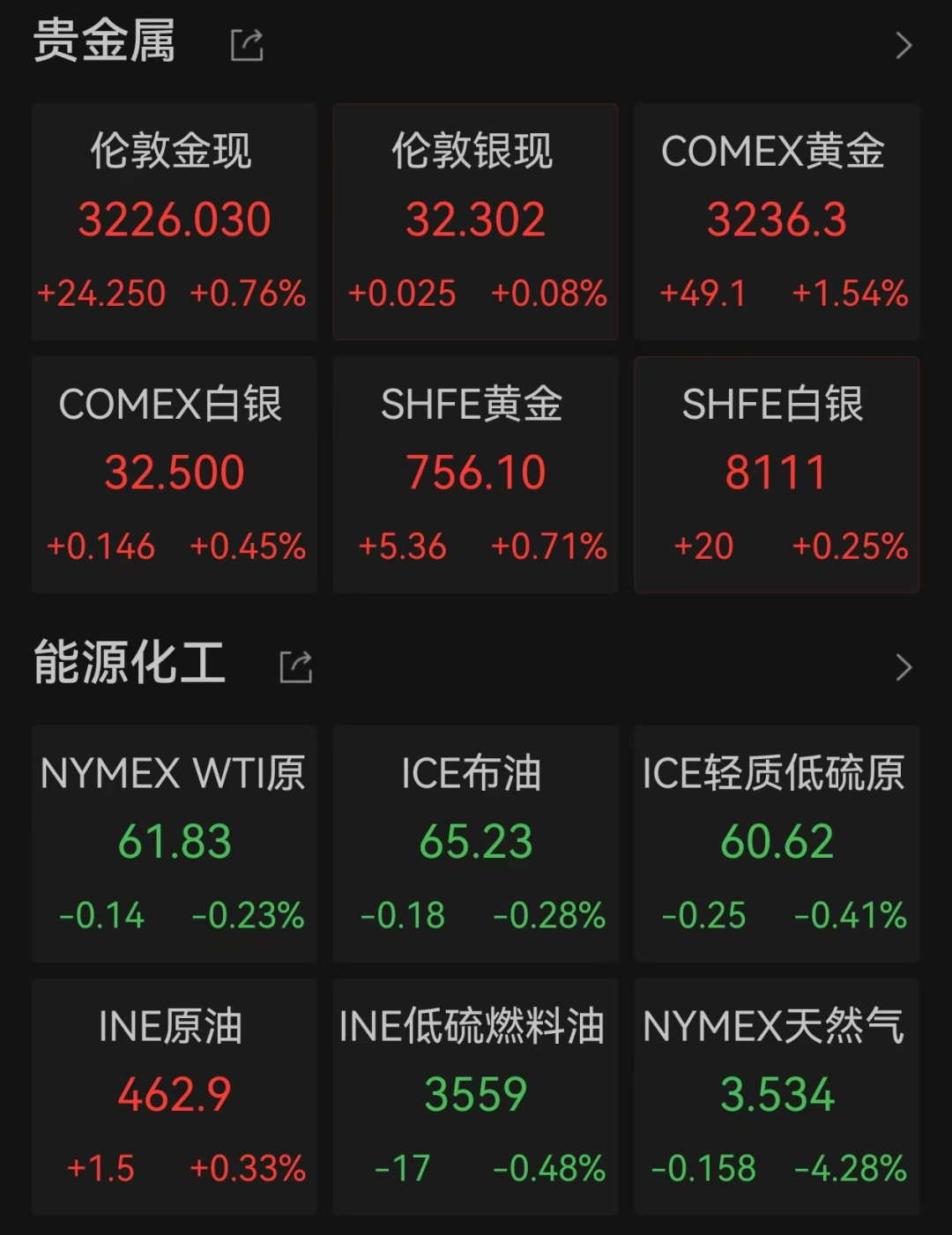 此外,现货黄金一度突破3230美元,目前报3226.03美元;原油期货有所下跌。