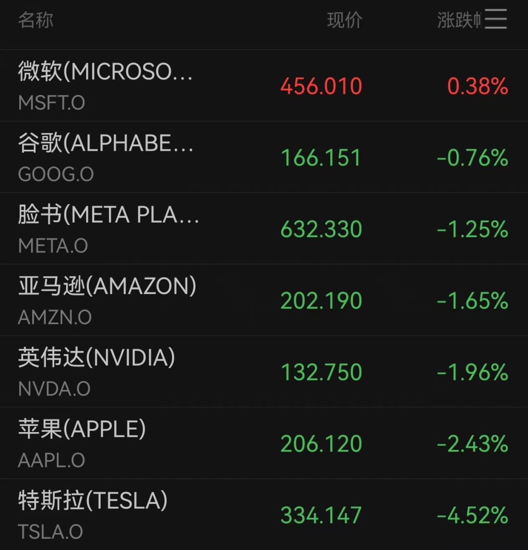 大型科技股普跌,特斯拉跌超4%,英伟达、台积电跌约2%。