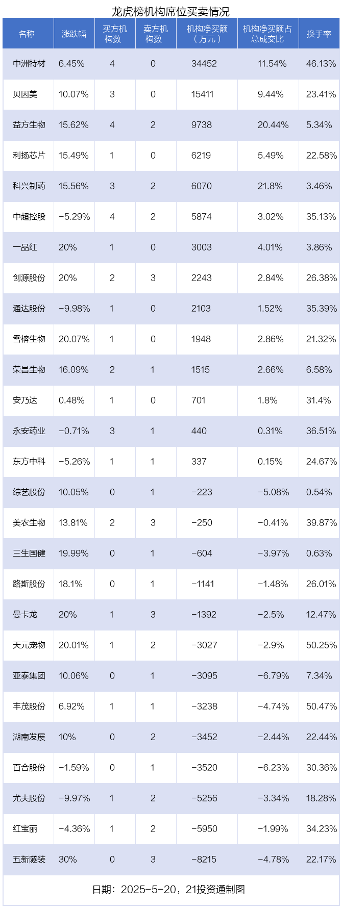 其中,机构净买入金额最多的是中洲特材(300963.SZ),当日收盘上涨6.45%,换手率为46.13%。