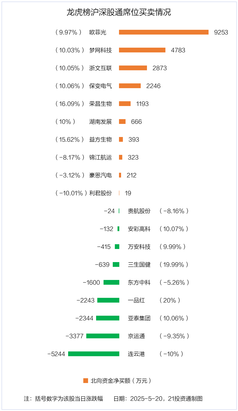 05月20日,北向资金参与龙虎榜中的个股共有19只,合计净买入5943.03万元。其中沪股通净买入5 股,净卖出6 股,合计净卖出4732.48万元;深股通净买入5 股,净卖出3 股,合计净买入1.07亿元。