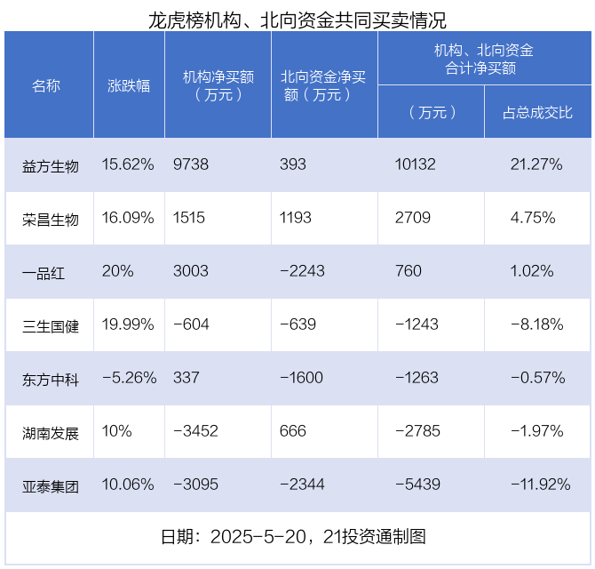 值得注意的是,机构和北向资金共同净买入了荣昌生物、益方生物等2股;共同净卖出了三生国健、亚泰集团等2股;在湖南发展,东方中科,一品红上出现分歧,机构净卖出湖南发展3451.84万元,北向资金净买入666.47万元;机构净买入东方中科336.58万元,北向资金净卖出1599.62万元;机构净买入一品红3002.56万元,北向资金净卖出2242.55万元。