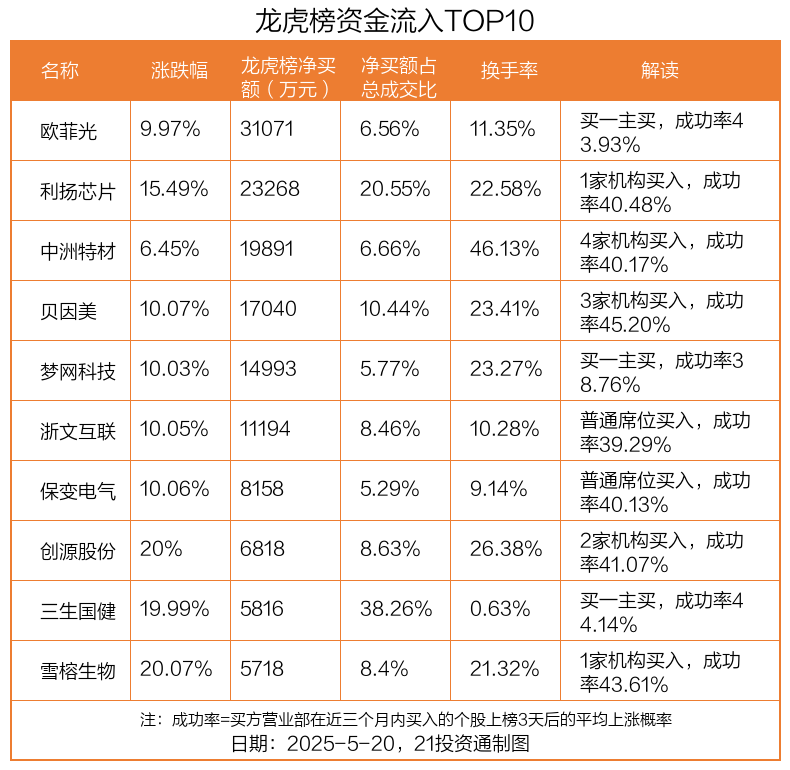 5月20日,上证指数上涨0.38%,深证成指上涨0.77%,创业板指上涨0.77%。盘后龙虎榜数据显示,共有58只个股因当日异动登上龙虎榜,资金净流入最多的是欧菲光(002456.SZ),达3.11亿元。