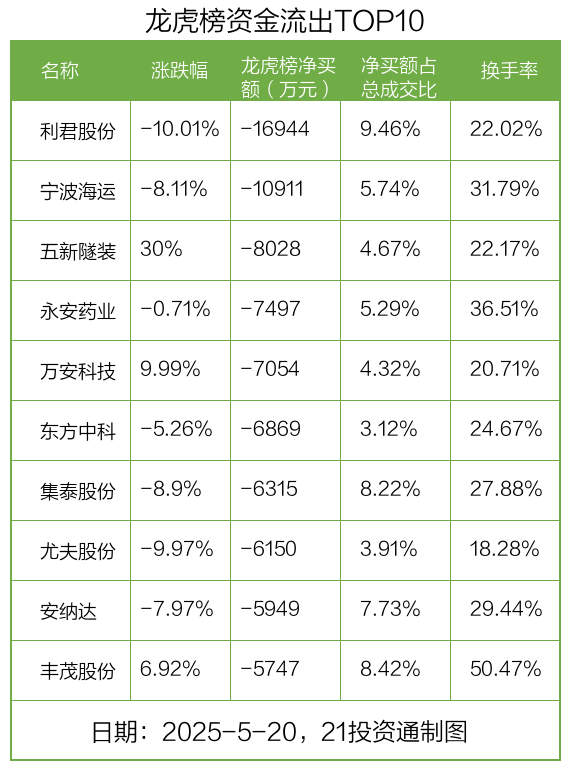 而龙虎榜中资金净流出最多的是利君股份(002651.SZ),被净卖出为1.69亿元,占总成交金额的9.46%。利君股份收盘下跌10.01%,换手率为22.02%。