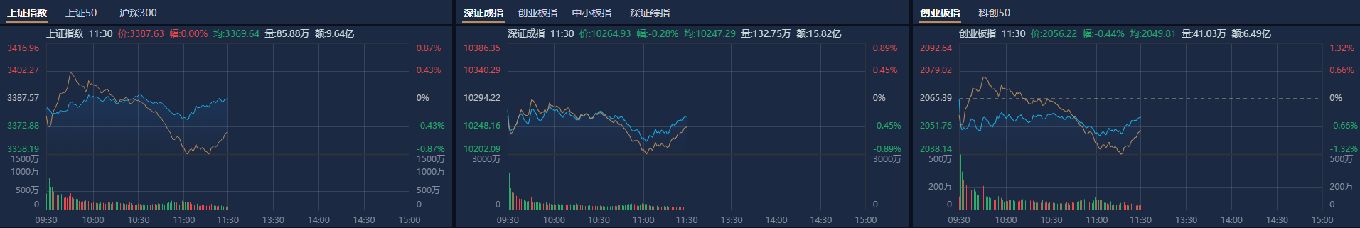 市场早盘震荡调整,三大指数涨跌不一,北证50指数跌超4%。南财金融终端显示,截至早盘收盘,沪指涨0.00%,深成指跌0.28%,创业板指跌0.44%。