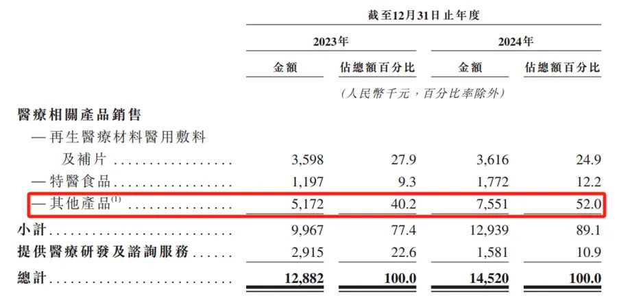 此外,报告期内,再生医学材料医用敷料及补片销售的收益分别为360万元及360万元,占总收益的比例分别为27.9%及24.9%。