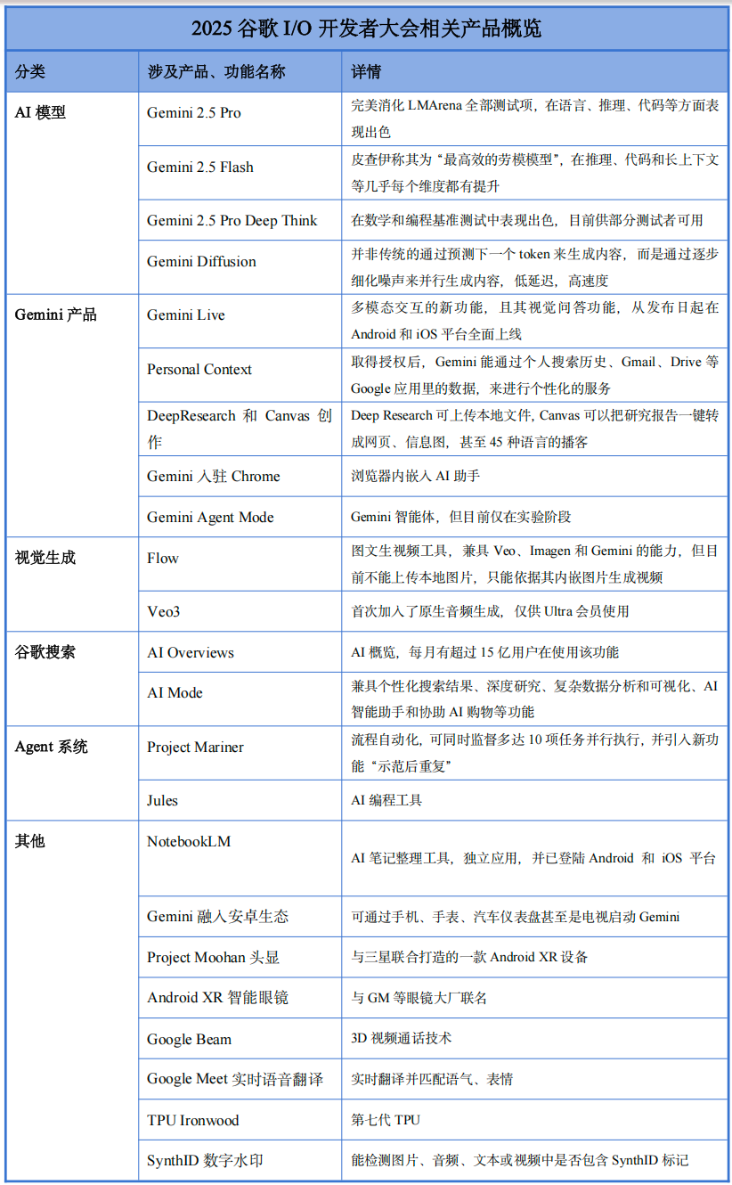 2025年这次发布会,几乎所有可能与AI相关的领域,谷歌都有涉及。围绕谷歌自有生态,本次发布会共宣布23项功能更新,覆盖AI模型、Gemini产品、视觉生产、谷歌搜索、Agent系统、AI眼镜、生态等各个方面。
