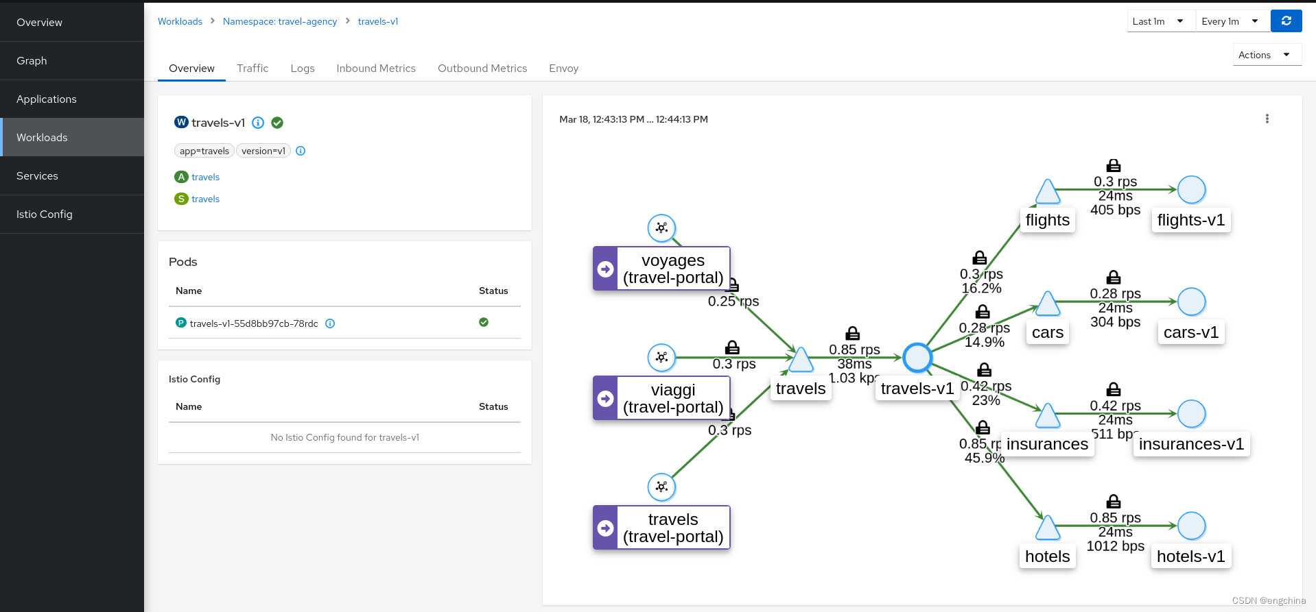 查看网格的状态,一切似乎都很正常,但也要注意,与 travel-agency 命名空间中包含的其他服务相比,hotels 服务的负载更大。