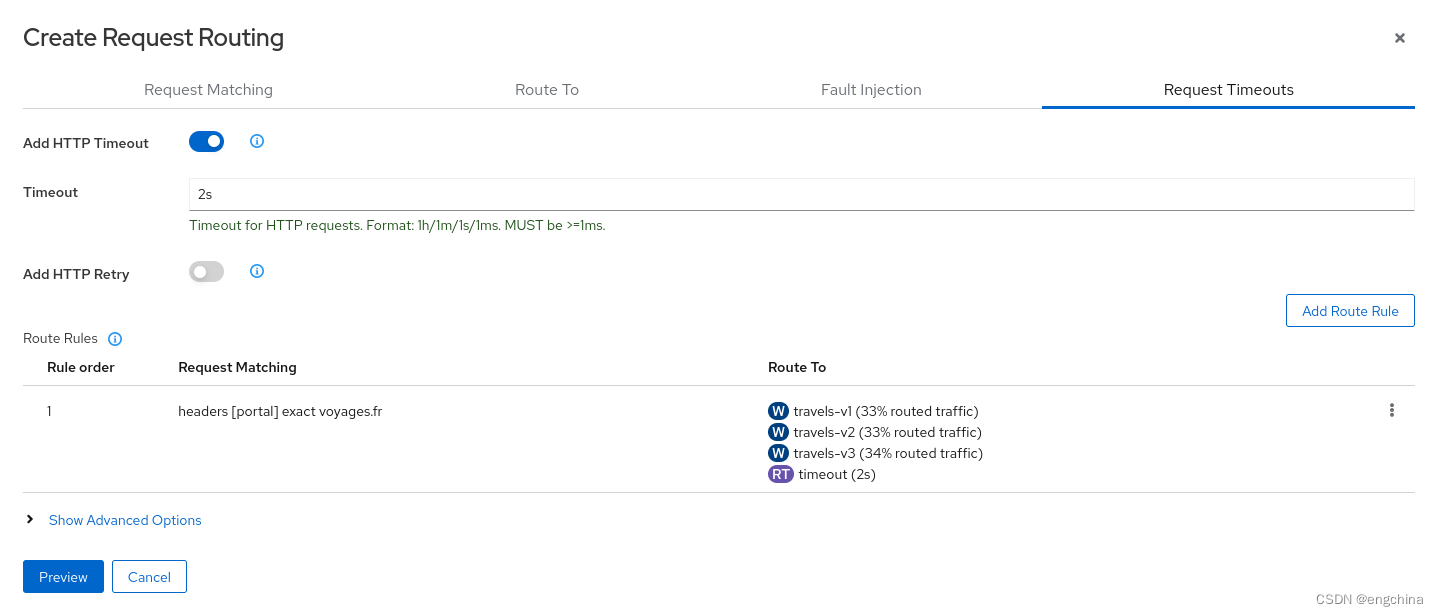 此步骤将显示如何为部署在旅行门户命名空间中的某个门户添加请求超时。travel.uk 和 viaggi.it 门户将接受延迟,但 voyages.fr 将超时并失败。
