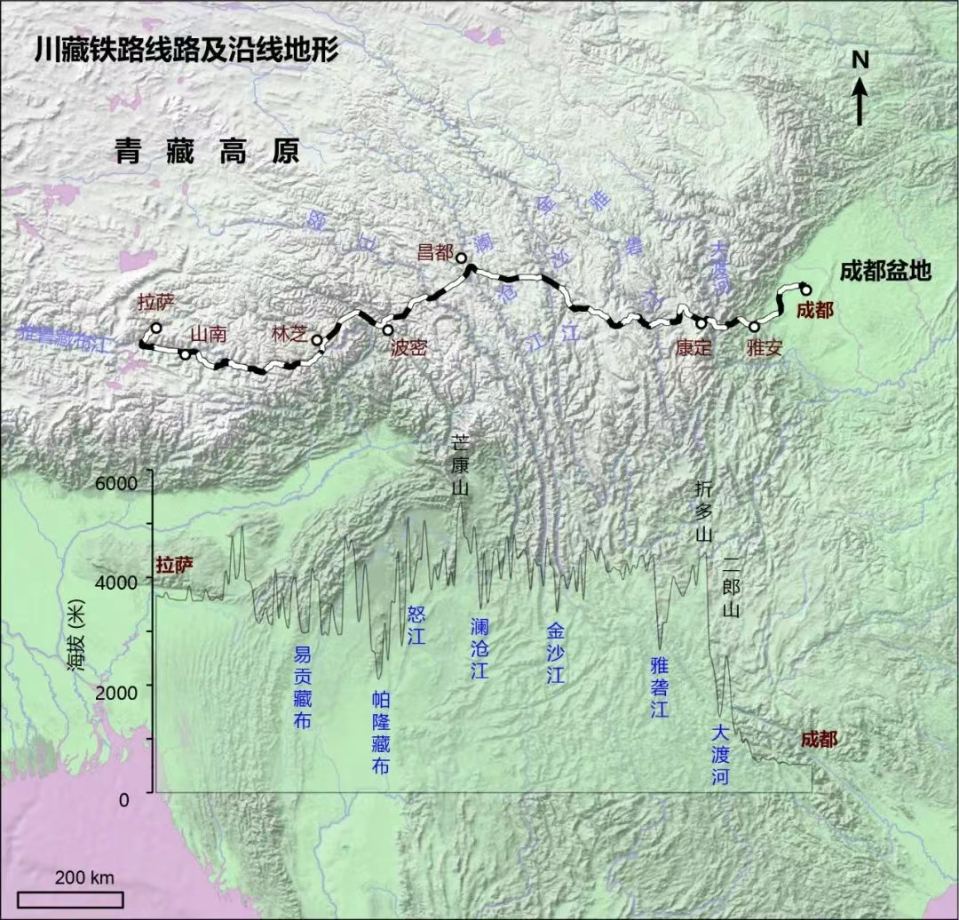 川藏铁路沿线经过了欧亚板块和印度洋板块碰撞所形成的横断山脉,需要穿越数座海拔4000米以上的高山,以及金沙江、怒江、大渡河、雅鲁藏布江等几条大河,有着“穿八山、跨七河”之称。