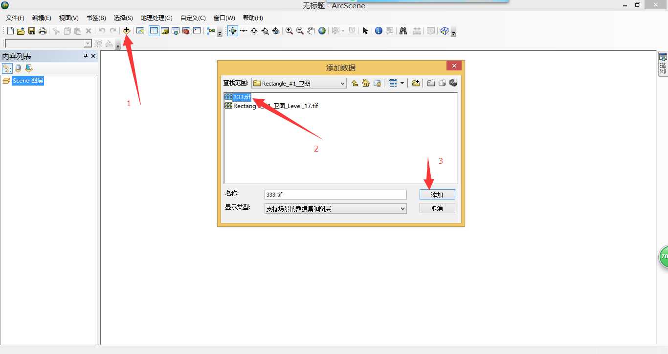 接下来打开ARC SCENE ,打开ARC SCENE过后,打开转换后的卫星影像,打开过后步骤如图: