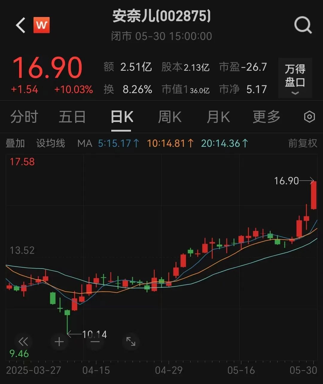 5月30日,也即节前的最后一个交易日,安奈儿开盘不久股价就封住涨停板,并持续到下午收盘。截至5月30日收盘,安奈儿股价报16.9元,最新市值为36亿元。