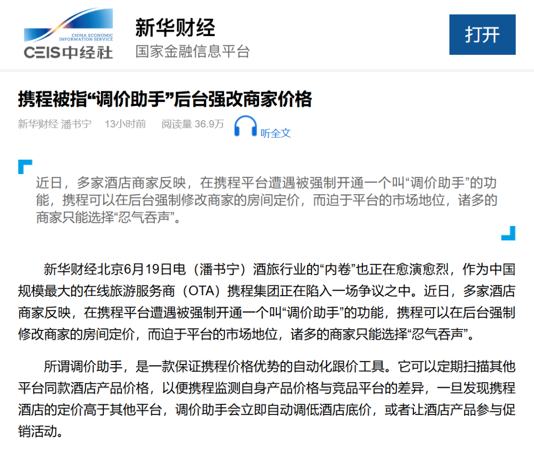 据新华财经报道,不少商家反映,在携程平台遭遇被强制开通一个叫“调价助手”的功能,携程可以在后台强制修改商家的房间定价。