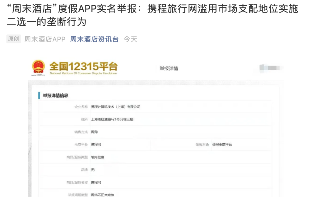 2021年国庆期间,周末酒店平台就公开实名举报携程称,其连续接到各大合作酒店通知下架发布于该平台上的产品的要求。原因是酒店收到携程通知,要求与周末酒店有合作关系的酒店下架发布于该平台上的产品,否则将面临携程取消特牌、限流等处罚和限制。