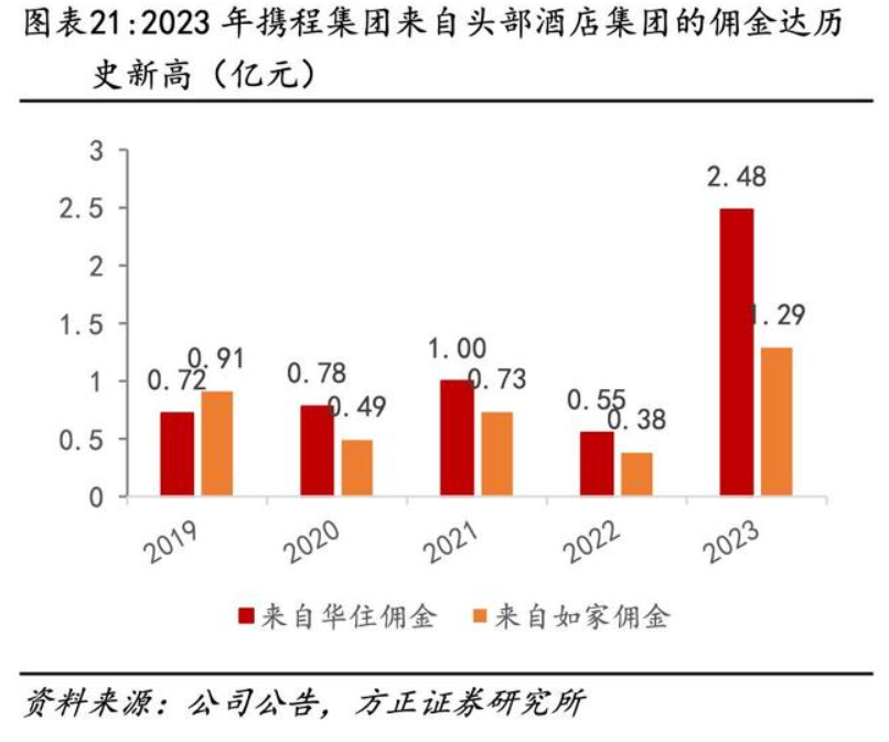 佣金对OTA平台来说,是一笔不小的收入:方正证券研报数据显示,2023年携程来自华住/如家的佣金分别为2.48/1.29亿元,较2019年分别增长了244%、42%。