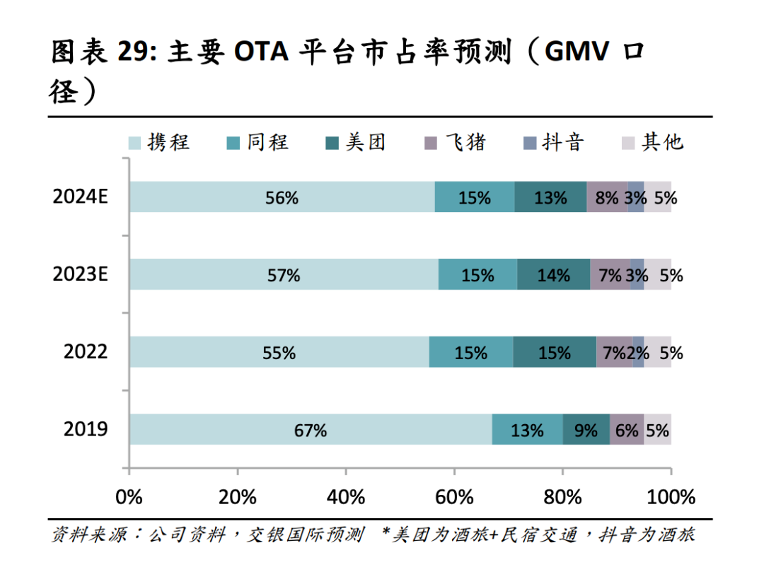 然而,理想很丰满,现实却骨感。尽管打出了“低佣金”和“不做OTA”的旗号,飞猪的市场份额却远未达到预期。交银国际研报预测数据显示:2024年,以GMV计算,携程以56%的市占率稳坐头把交椅,而飞猪的份额仅为8%。同程、美团、抖音则分别为15%、13%、3%。