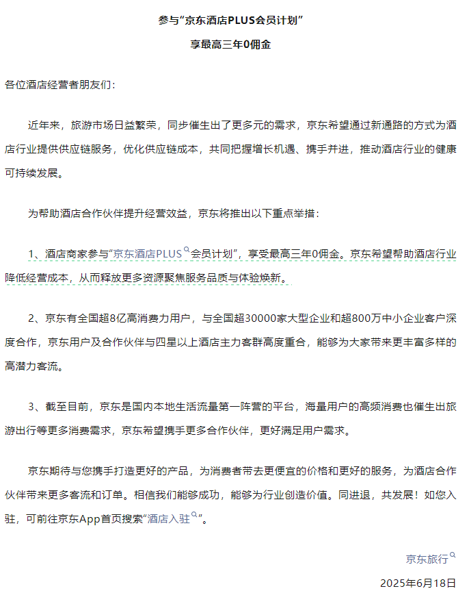 6月18日,京东黑板报发布《致全体酒店经营者的一封公开信》,正式宣布入局酒旅行业,并提出,酒店商家参与“京东酒店PLUS会员计划”,享受最高三年0佣金。