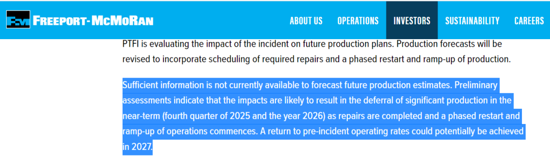 9月24日,美国矿业巨头自由港-莫克莫兰(以下简称“自由港”) 公司发布公告表示,其位于印尼的Grasberg矿山因泥石流事故停产,启动不可抗力条款,Grasberg项目在2025年四季度将减产20万金属吨,2026年减产近27万吨,预计最早要到2027年才能恢复到事故前的生产水平。