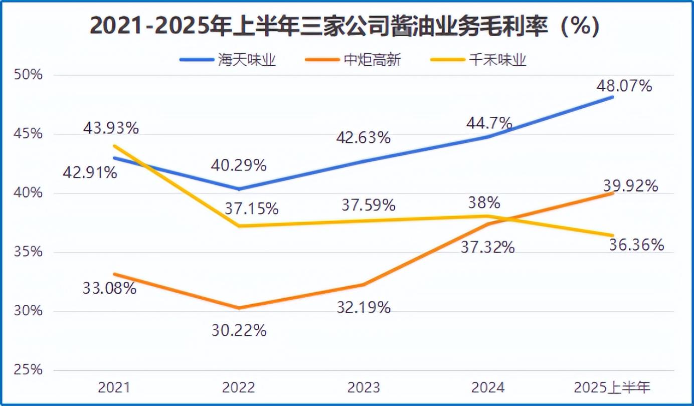 这种全方位的优势,最终在毛利率上体现得淋漓尽致。2020-2025年上半年,海天味业的毛利率一直领先于中炬高新和千禾味业,成本控制能力的差距一目了然。