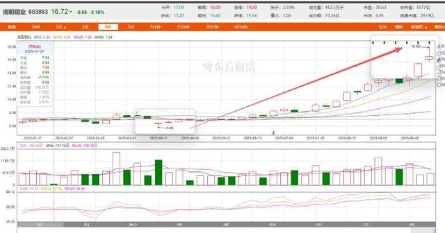 根据记者的观察,自今年4月以来,洛阳钼业的股价已上涨近6个月,从最低的5.66元/股一路攀升至10月10日的18元/股,涨幅达到218%。