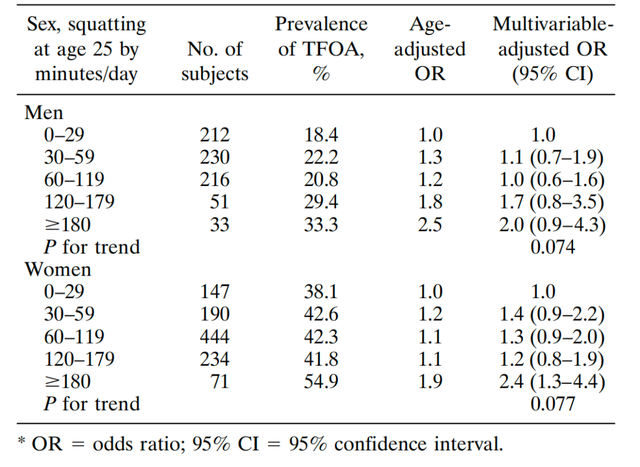 [1] Zhang, Y., Hunter, D. J., Nevitt, M. C., Xu, L., Niu, J., Lui, L.-Y., Yu, W., Aliabadi, P., & Felson, D. T. (2004). Association of squatting with increased prevalence of radiographic tibiofemoral knee osteoarthritis: The Beijing Osteoarthritis Study. Arthritis & Rheumatism, 50(4), 1187–1192.