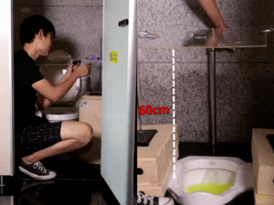 “逗比实验室”团队曾专门做过一期测试,将玻璃板分别放置在马桶和蹲便器上方20厘米、40厘米和60厘米处,测试马桶和蹲便器冲水时的飞溅高度。结果发现无论在什么高度,马桶上方玻璃上的水滴都比坐便器上方玻璃上的少,在高度40厘米时,坐便上方的玻璃板已经相当干净,而在高度60厘米时,蹲坑上方的玻璃板还有水滴。