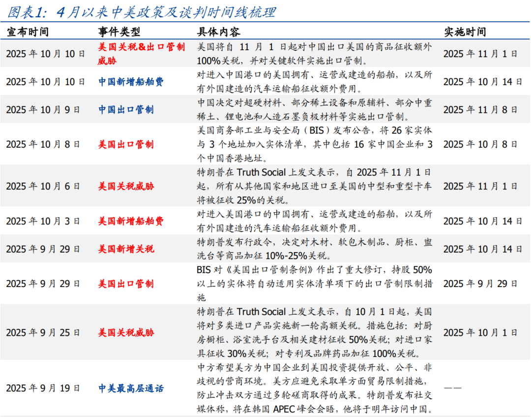 9月底以来美国发起多项新关税,随后中国对等反制、尤其是稀土,美国之后进一步威胁将对华商品征收额外的100%关税、并表示关键软件将对华实施出口管制。从时间上看,截至10月12日,本轮中美冲突升级大体可分为三个小阶段:
