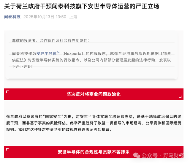 北京时间10月12日晚间,闻泰科技在官方微信公众号上发布《关于荷兰政府干预闻泰科技旗下安世半导体运营的严正立场》(下称:《声明》),《声明》包括要求荷兰政府立即撤销错误指令、停止对中国企业的系统性歧视、维护全球半导体产业链的开放与合作三项内容。