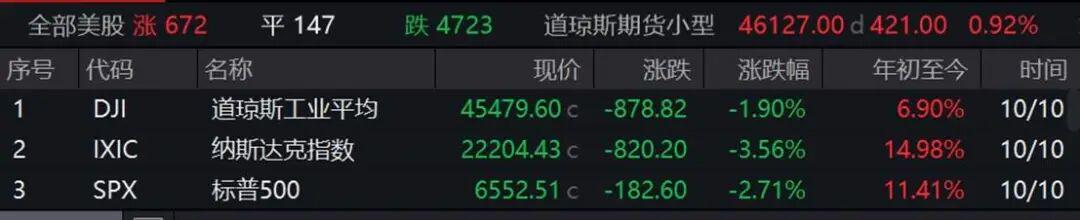 回顾近期,海外市场方面,美股一度遭遇“黑色星期五”。美当地时间10月10日,美国金融市场出现罕见的“股债汇三杀”局面:美股三大指数集体大幅下跌,纳斯达克指数暴跌3.56%,标普500指数下跌2.71%,均创4月以来最大单日跌幅;科技板块及半导体股损失尤为惨重。同在10日,美债收益率集体走低,2年期和10年期分别下跌1.63和1.95个基点;美元指数当日下跌0.56%,收报98.977。