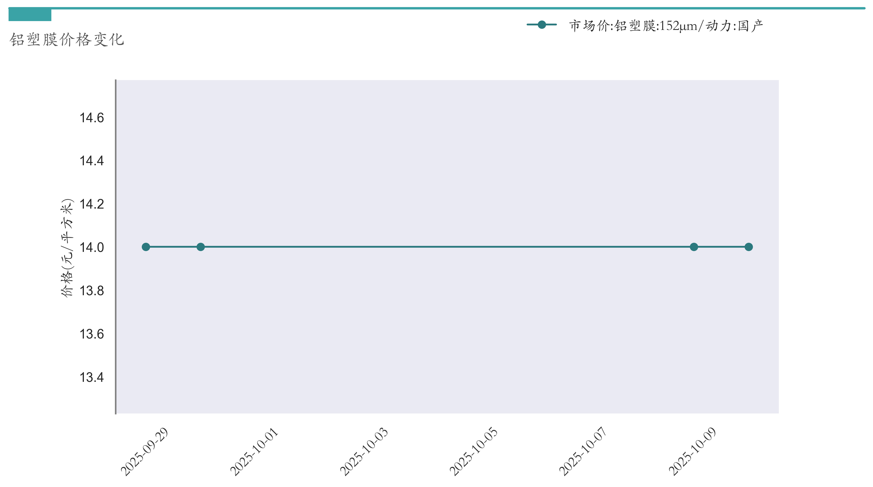 截至10月10日,152μm铝塑膜市场报价为14元/平方米,较9月30日持平。近两周铝塑膜价格变化如下图所示: