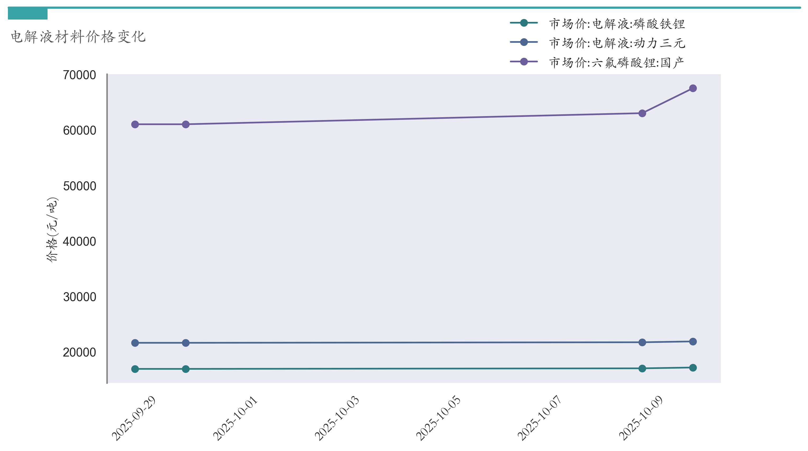 截至10月10日,六氟磷酸锂市场报价为67500元/吨,较9月30日上涨6500元/吨。电解液(磷酸铁锂)市场报价为17150元/吨,较9月30日上涨250元/吨。电解液(动力三元)市场报价为21850元/吨,较9月30日上涨250元/吨。近两周电解液材料价格变化如下图所示: