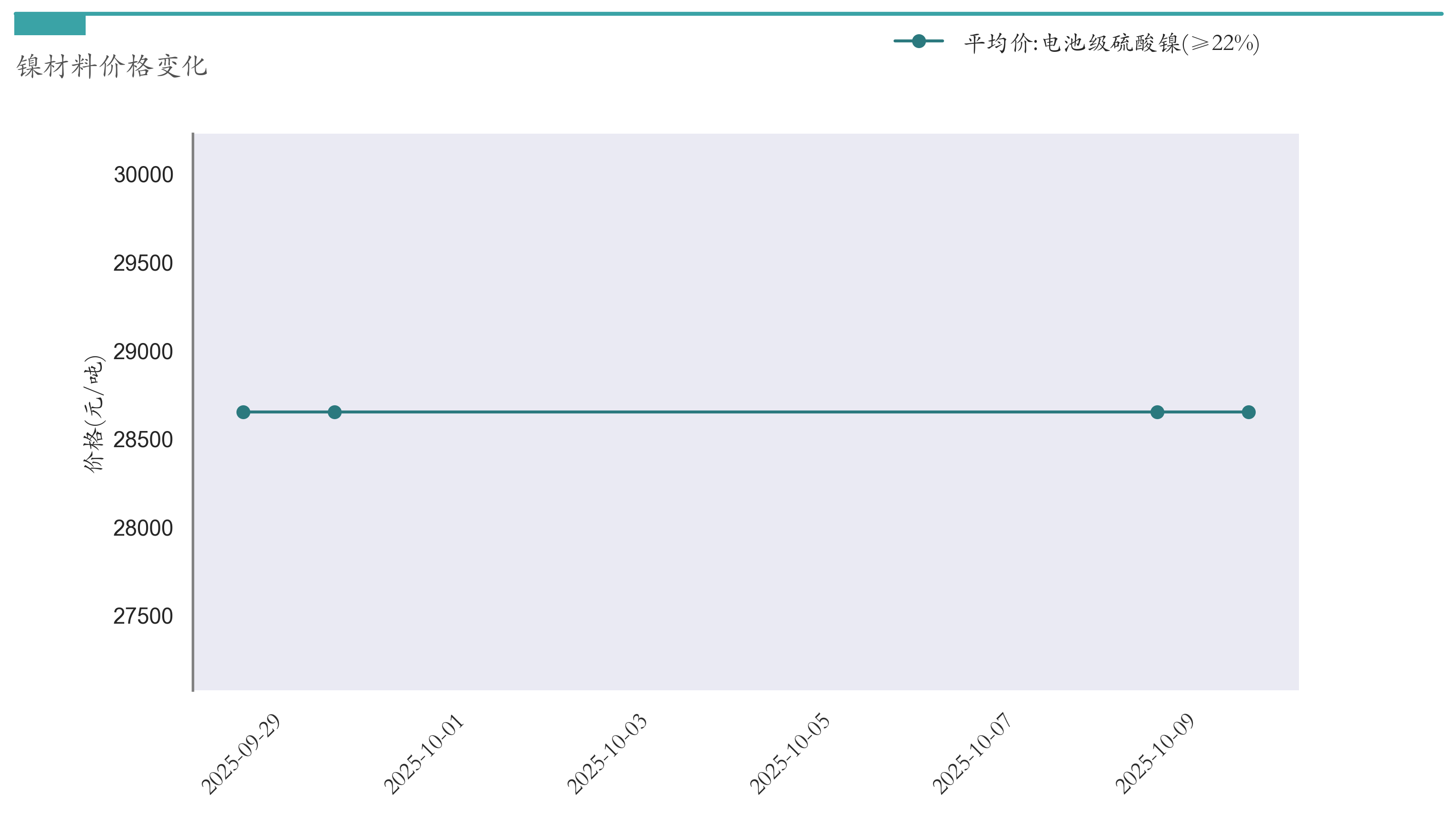 截至10月10日,电池级硫酸镍平均报价为28650元/吨,较9月30日持平。近两周镍材料价格变化如下图所示: