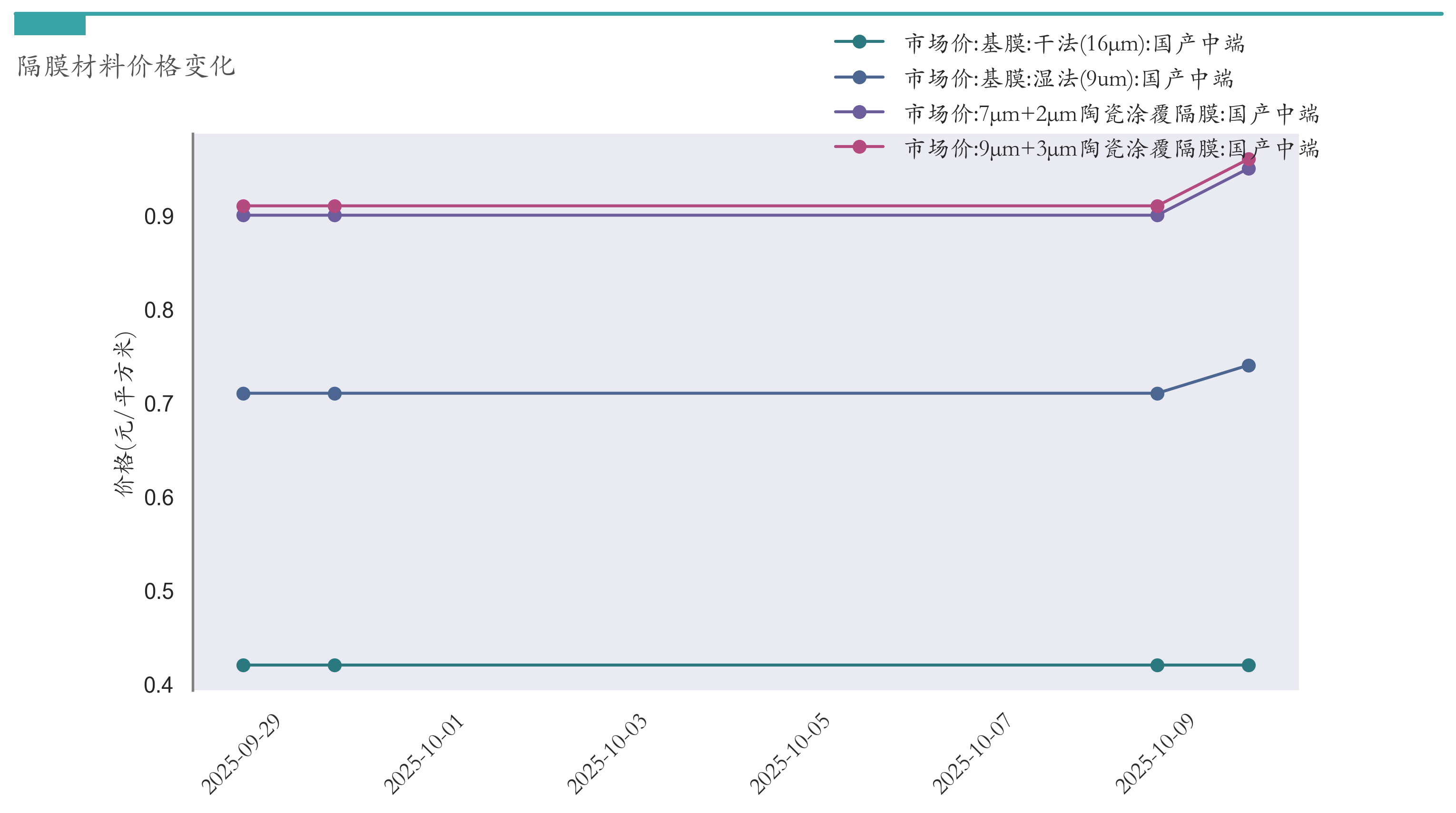 截至10月10日,干法16μm基膜市场报价为0.42元/平方米,较9月30日持平。湿法9um基膜市场报价为0.74元/平方米,较9月30日上涨0.03元/平方米。7μm+2μm陶瓷涂覆隔膜市场报价为0.95元/平方米,较9月30日上涨0.05元/平方米。9μm+3μm陶瓷涂覆隔膜市场报价为0.96元/平方米,较9月30日上涨0.05元/平方米。近两周隔膜材料价格变化如下图所示: