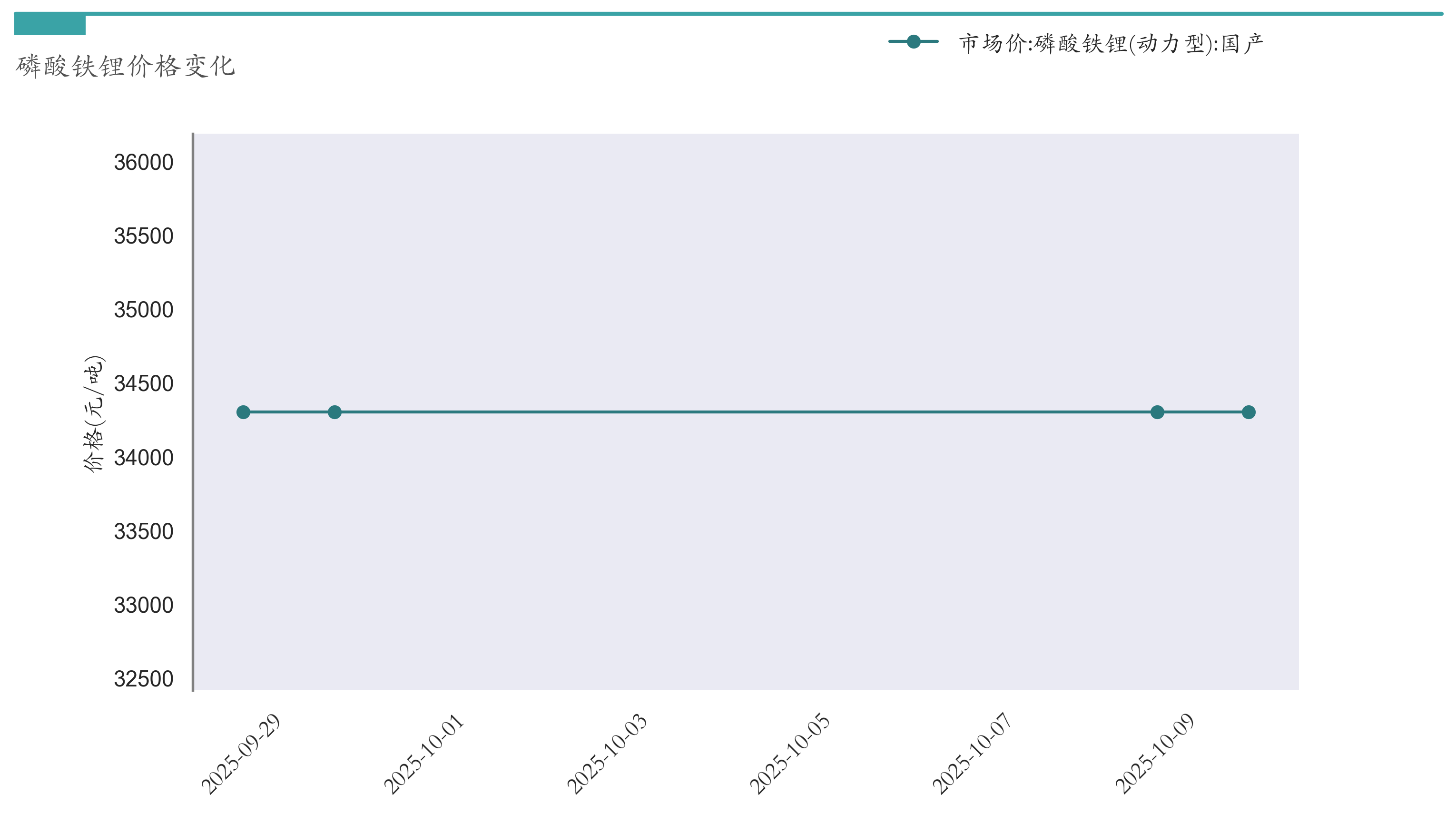 截至10月10日,磷酸铁锂市场报价为34300元/吨,较9月30日持平。近两周磷酸铁锂价格变化如下图所示: