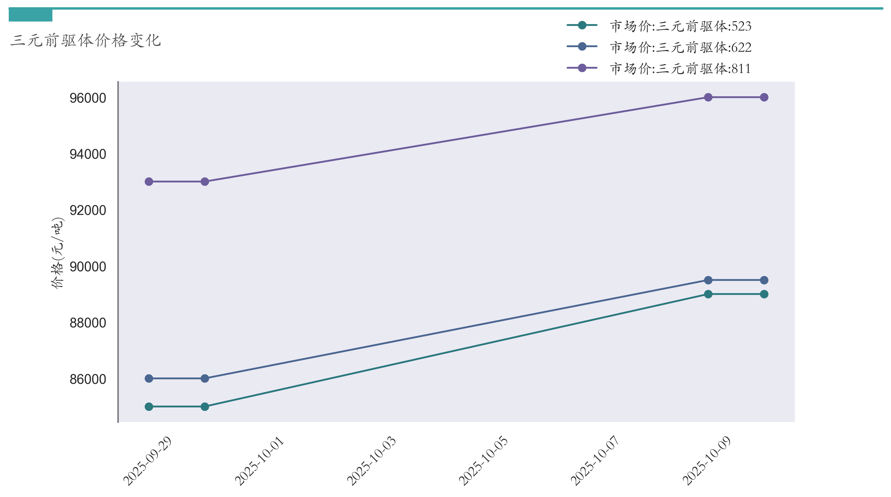 截至10月10日,三元前驱体811市场报价为96000元/吨,较9月30日上涨3000元/吨。三元前驱体622市场报价为89500元/吨,较9月30日上涨3500元/吨。三元前驱体523市场报价为89000元/吨,较9月30日上涨4000元/吨。近两周三元前驱体价格变化如下图所示: