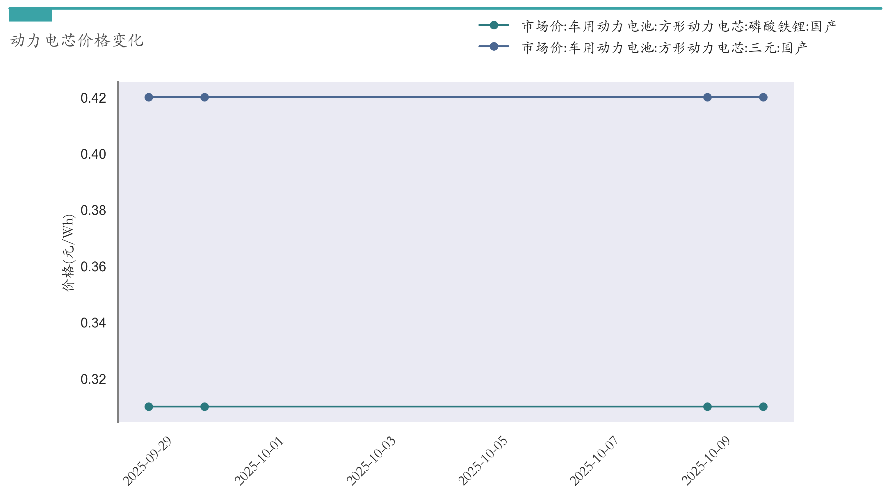 截至10月10日,方形动力电芯(磷酸铁锂)市场报价为0.31元/Wh,较9月30日持平。方形动力电芯(三元)市场报价为0.42元/Wh,较9月30日持平。近两周动力电芯价格变化如下图所示: