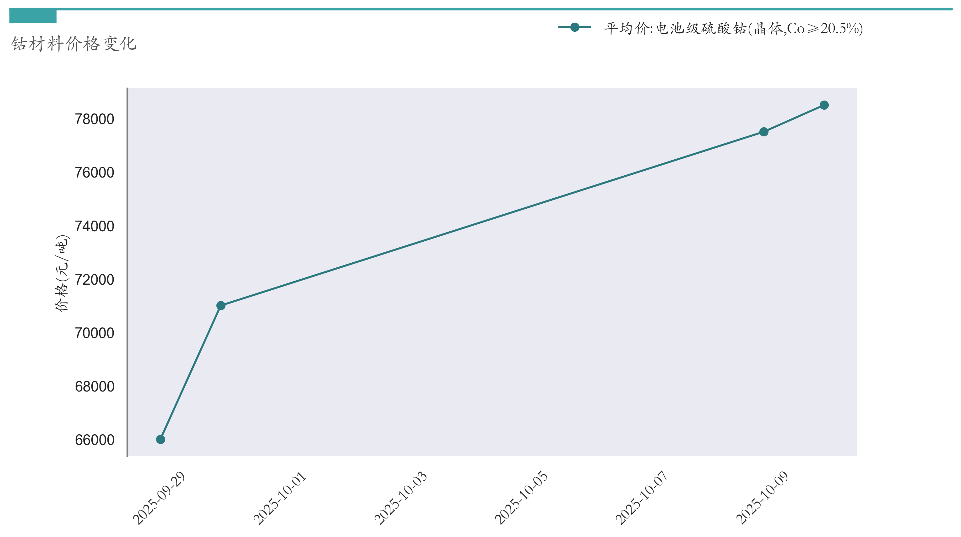 截至10月10日,电池级硫酸钴平均报价为78500元/吨,较9月30日上涨7500元/吨。近两周钴材料价格变化如下图所示: